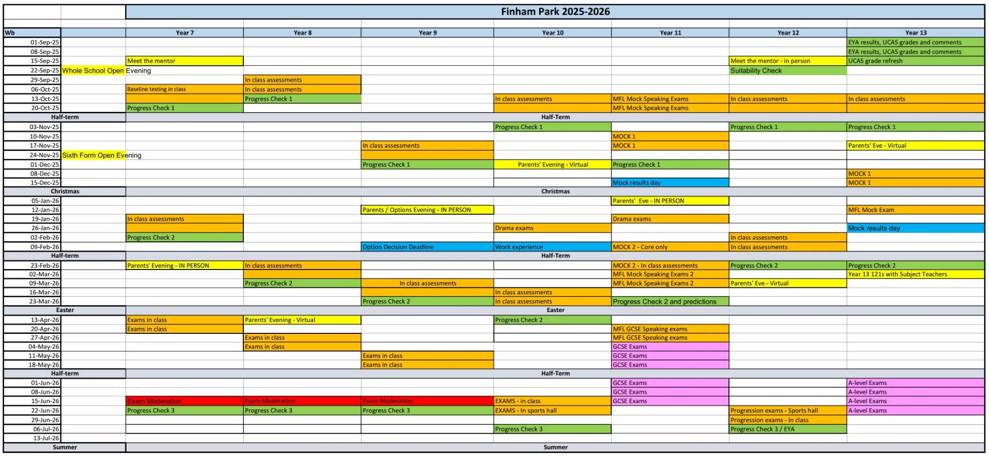 Finham Park Assessment Calendar (inc. Parents evenings)